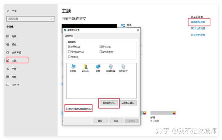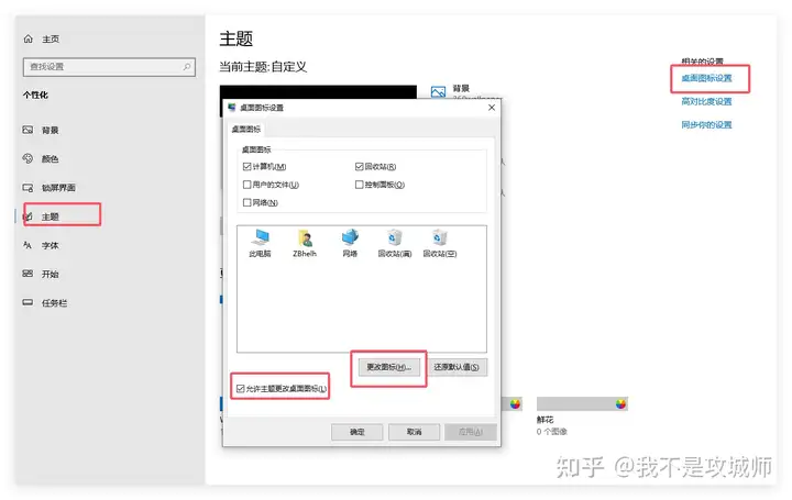 - 在弹出的对话框中,取消勾选“允许主题更改桌面图标”的选项,然后点击“应用”并“确定”。